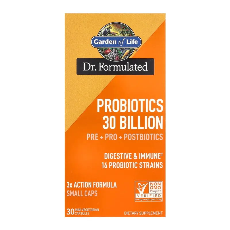 Garden of Life Dr. Formulated Probiotics 30 Billion delivers a complete pre + pro + postbiotic triple-action formula to support digestive balance, immune health, and beneficial gut bacteria growth — all in one shelf-stable daily capsule.