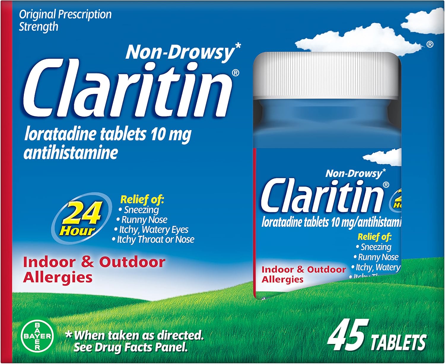 Claritin 10 mg 45 Tablets provide non-drowsy, 24-hour relief from seasonal allergy symptoms for adults and teens.